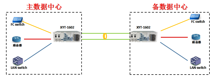 纤亿通科技根据某银行的需求提供“大容量、高安全、低时延、多业务”的金融数据中心灾备传输解决方案。两个数据中心之间通过波分设备,实现同城数据中心互联、实时备份,保障业务连续性,从而达到规避断纤、地震等不可抗力因素对某银行业务的影响。组网拓扑如下图所示: