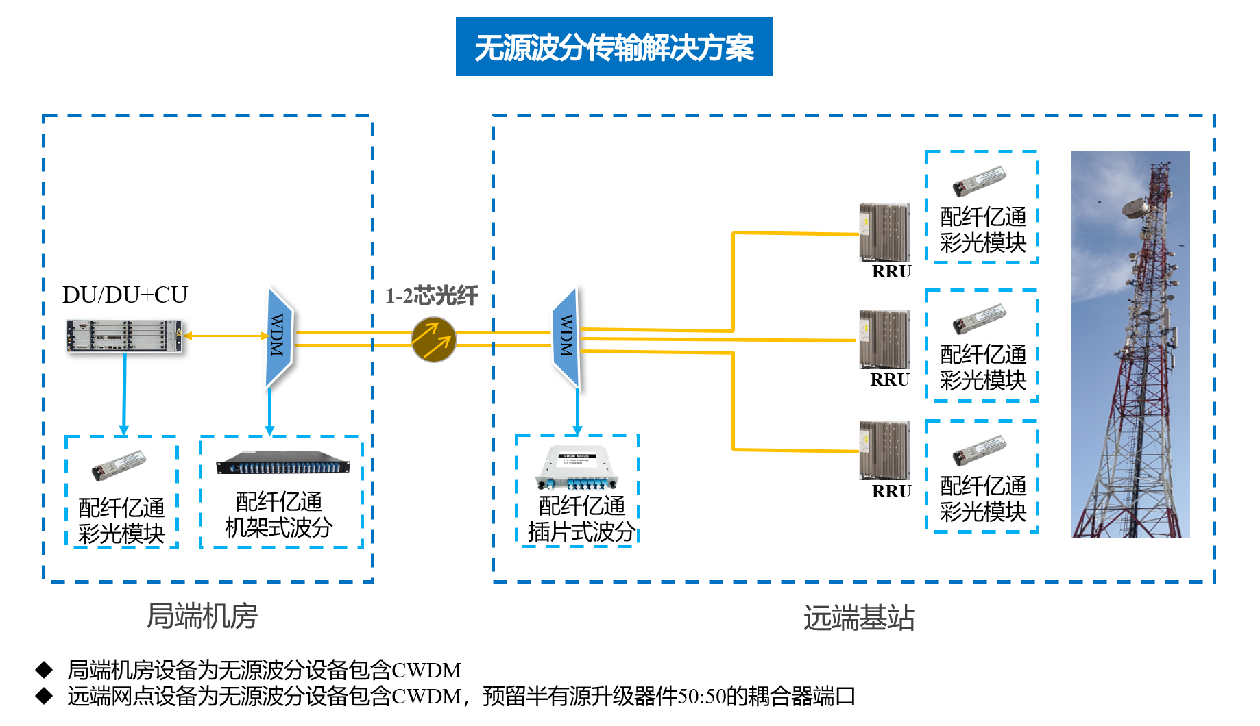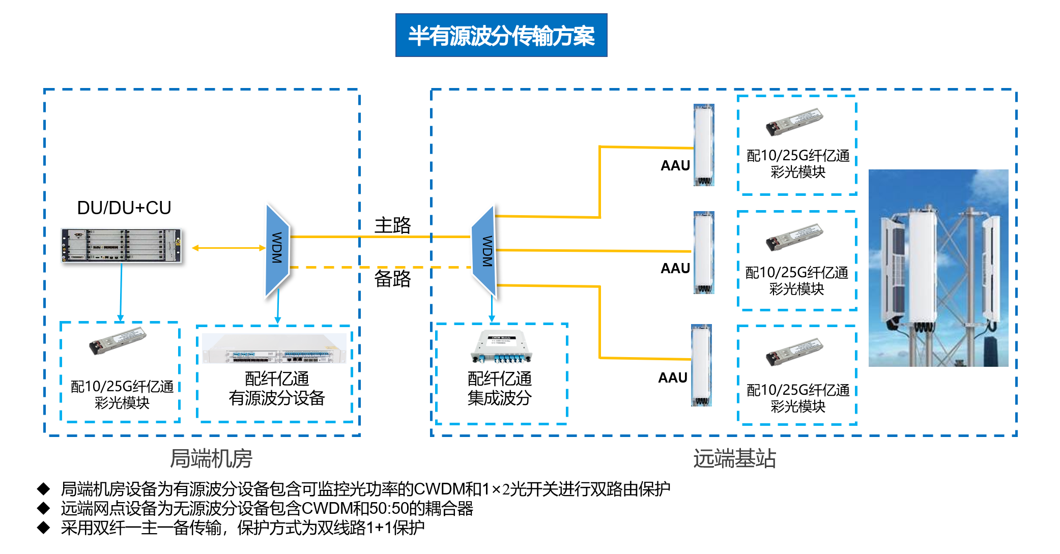 由上图可知,无源波分传输解决方案中,局端和远端均采用纤亿通无源波分设备,可以实现节省光纤、节约能源、节约成本、快速部署实施等功能,但缺陷是无法远程网管、监控线路光功率、线路保护等功能。在业务发展壮大中,会给线路保障和运维人员带来操作上的困难,但此方案中我们预留出了可供升级成为半有源传输解决方案的端口,可以使基站前传从原有的无源向更高级的半有源平滑演进与创新。