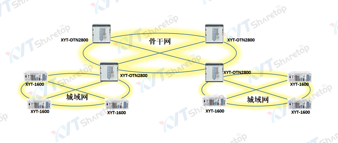 纤亿通主要提供政务专网的光传输网解决方案,包含骨干网和城域网搭建。骨干网主要采用XYT-OTN2800系列OTN光传送平台实现大容量传输,城域网主要采用XYT-1600系列有源波分综合传输平台实现扩容传输,多业务接入混合传输。