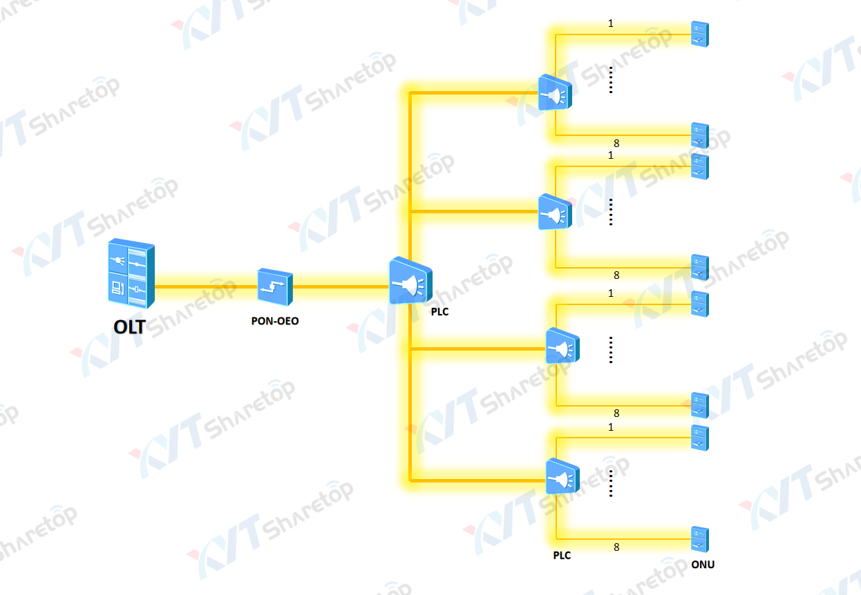 纤亿通光纤到户FTTH传输方案,局端机房采用EPON/GPON OLT,终端用户处采用ONU,中间采用无源分光系统(主要由PLC均分分光器组成)。对于部分偏远地区,局端机房和终端用户处距离较远,还可以采用GPON OEO单路拉远放大器,从而实现远距离覆盖,还可以有效提升OLT的端口利用率。