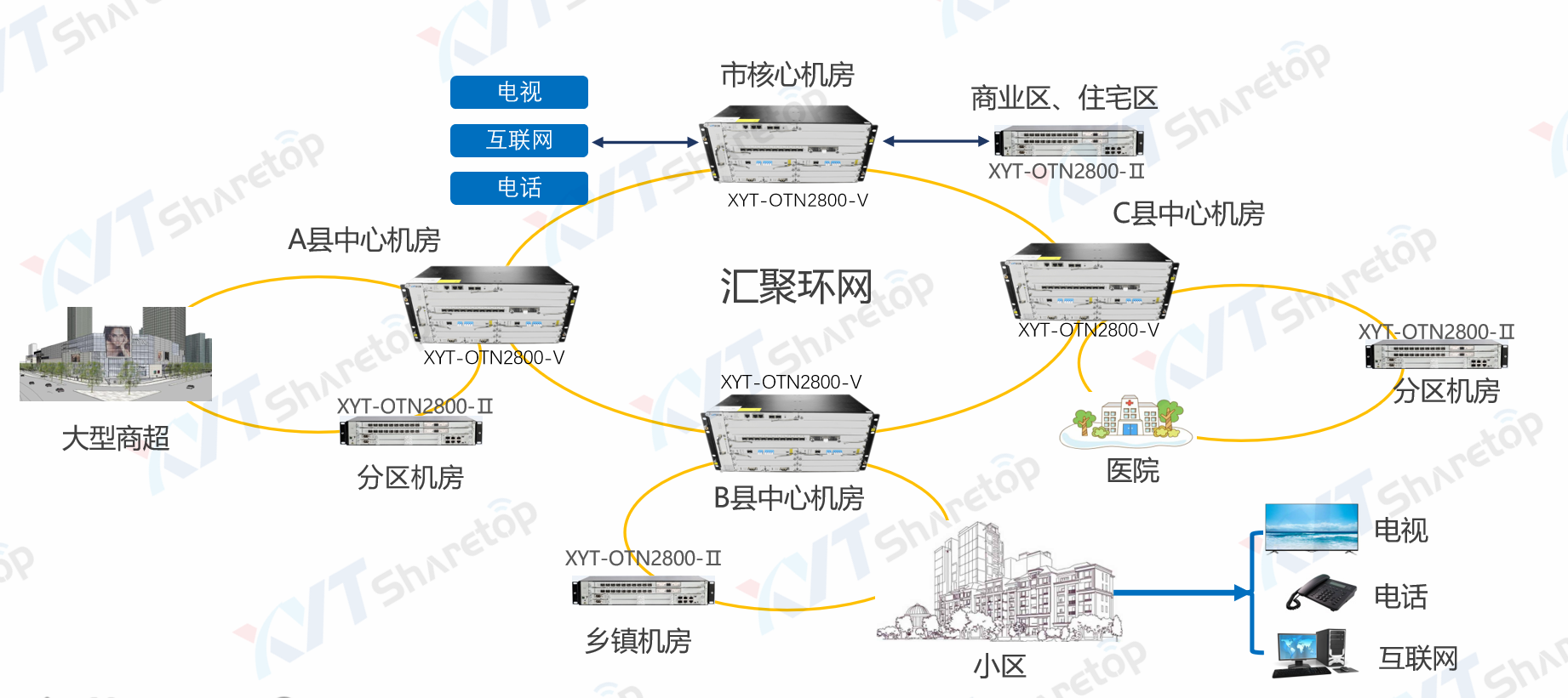 运营商城域汇聚网主要是汇聚市县区镇机房的业务,主要特点为:传输业务种类多,多种不同速率的业务混合传输,业务调度能力强,对设备性能要求高。纤亿通运营商城域汇聚网传输方案主要采用XYT-OTN2800光传送平台OTN设备和XYT-1600有源波分综合传输平台来搭建。