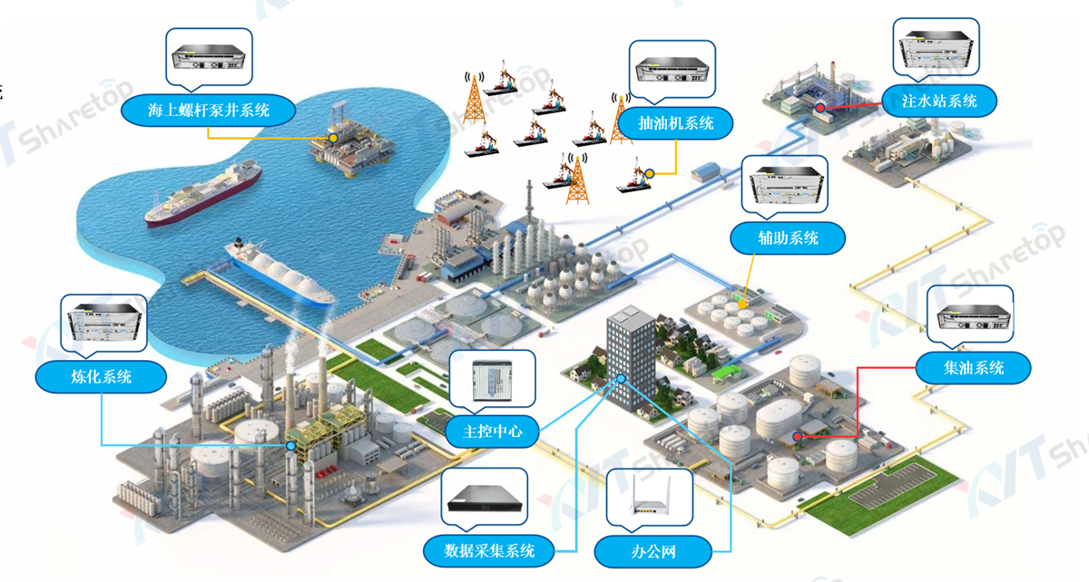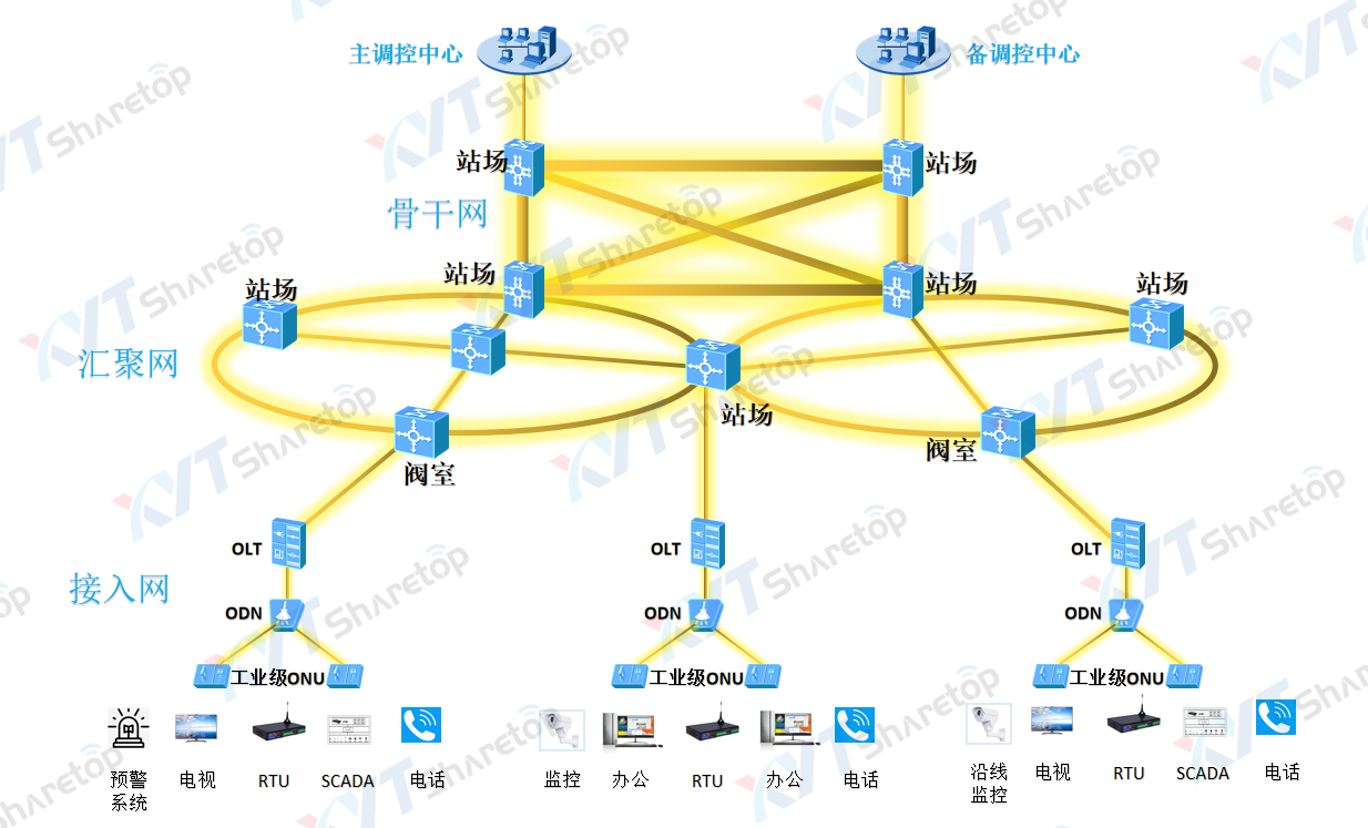 纤亿通智慧油气光传输专网解决方案基于全光网络解决方案,接入层使用OLT-PLC-ONU无源光网络,应用层通过ONU接入专网传输系统,实现一网多用,一张网络同时承载多个网络,如预警系统、电视、电话、RTU、SCADA、监控系统等。