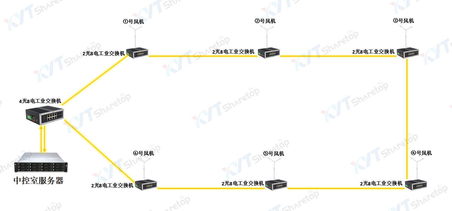 当风机数量较多,且成群分布时,这个时候如果还采用光纤收发器直连中控室的方案,那就需要布设大量的光纤,不仅会提升成本且容易造成线路混乱,给维护带来极大的麻烦。所以正确的方法是采用纤亿通工业级交换机来组环网,如下图:
