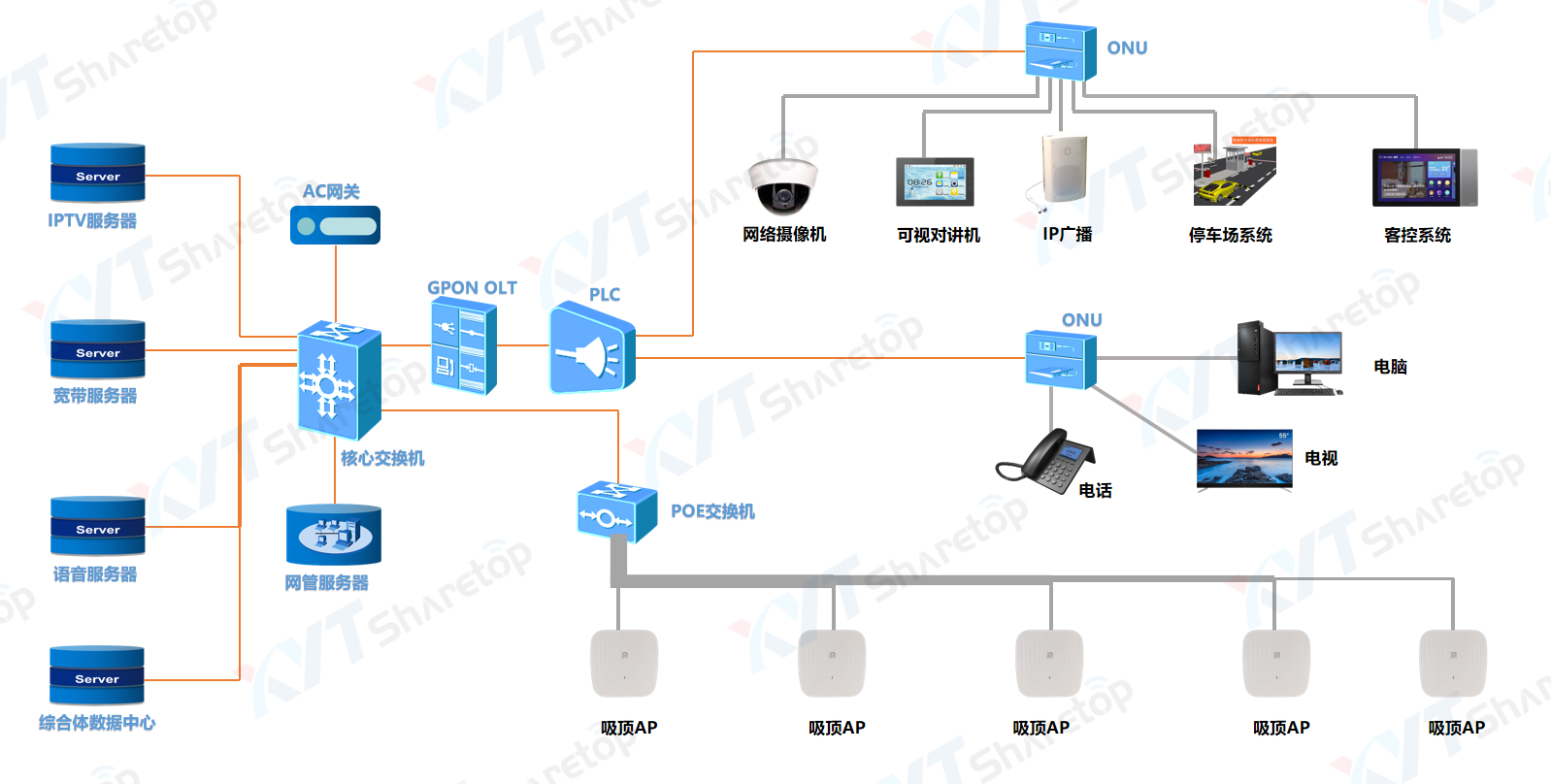 纤亿通商业综合体全光网络方案,以PON系统为主,无源分光系统为辅,采用融合通信技术,搭建一张覆盖整个商业综合体的全光网络,实现一网多用,可容纳的商业综合体的各种通信系统,如互联网有线和无线接入、电话网、IPTV电视网、IP广播网、停车场系统、监控系统、客控系统等。网络结构如下图: