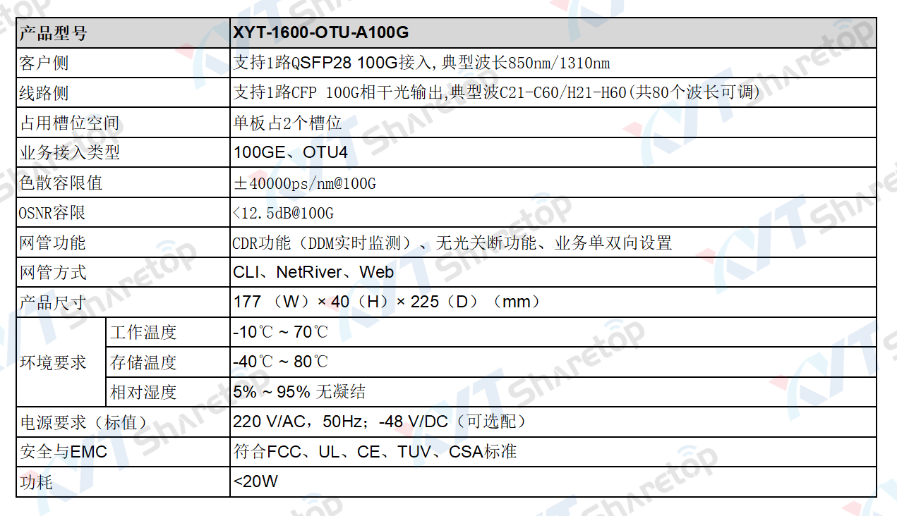 100GCFP OTU板(XYT-1600-OTU-A100G)是一款用于100G业务接入的功能板卡,该板卡功能强大,可实现对CFP相干光模块波长调谐,输出DWDM标准波长光信号,配合波分设备或者OTN设备实现超大带宽T级业务量传输。广泛应用于运营商骨干网建设、政企骨干网建设、数据骨干线路传输。