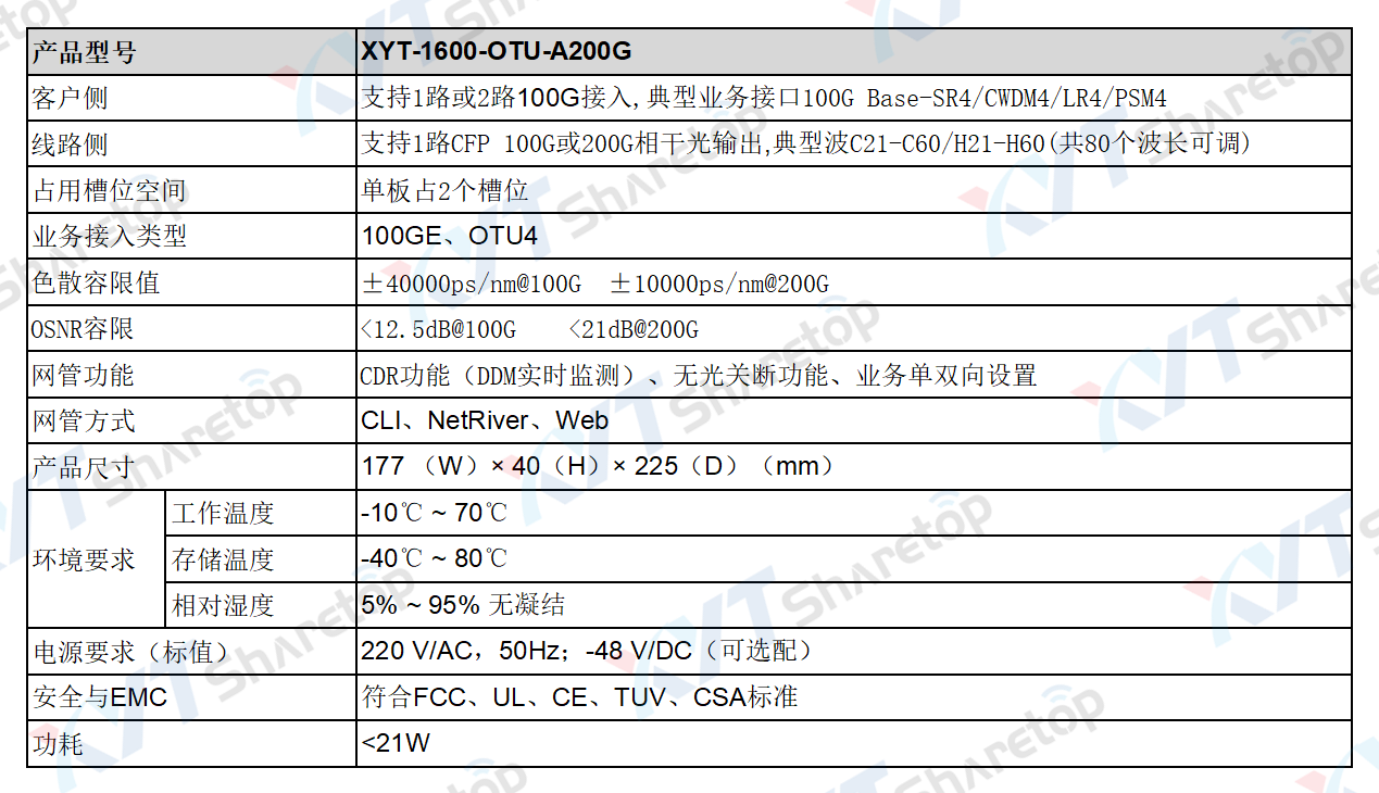 200GCFP OTU板(XYT-1600-OTU-A200G)是一款用于200G业务接入的功能板卡,该板卡功能强大,可实现对CFP相干光模块波长调谐,输出DWDM标准波长光信号,配合波分设备或者OTN设备实现超大带宽T级业务量传输。广泛应用于运营商骨干网建设、政企骨干网建设、数据骨干线路传输。