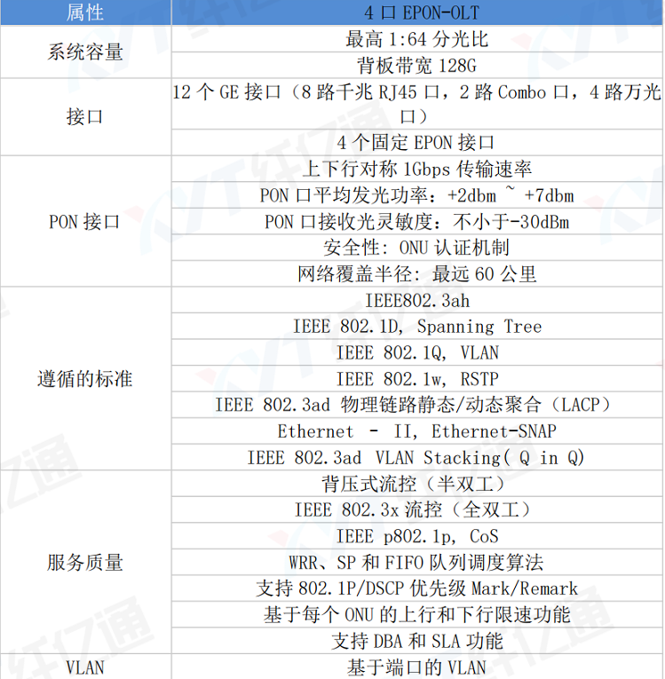 4口EPON-OLT是一款遵循IEEE802.3ah和中华人民共和国通讯行业标准(YD/T 1475-2006)的OLT设备,全面支持CTC2.0/2.1,自动发现和兼容各厂商ONU。组建高效的EPON解决方案。 4口EPON-OLT支持1.25Gbps的PON传输速率,高效的带宽利用率和以太网业务支持能力帮助运营商为他们的用户提供可靠的业务质量保证。 高达1:64的分光比,支持不同类型ONU的混和组网,使得运营商的投资做到最小化。 4口EPON-OLT采用业界先进的技术,在以太网业务上具有强大的功能和QoS保证,支持SLA和DBA