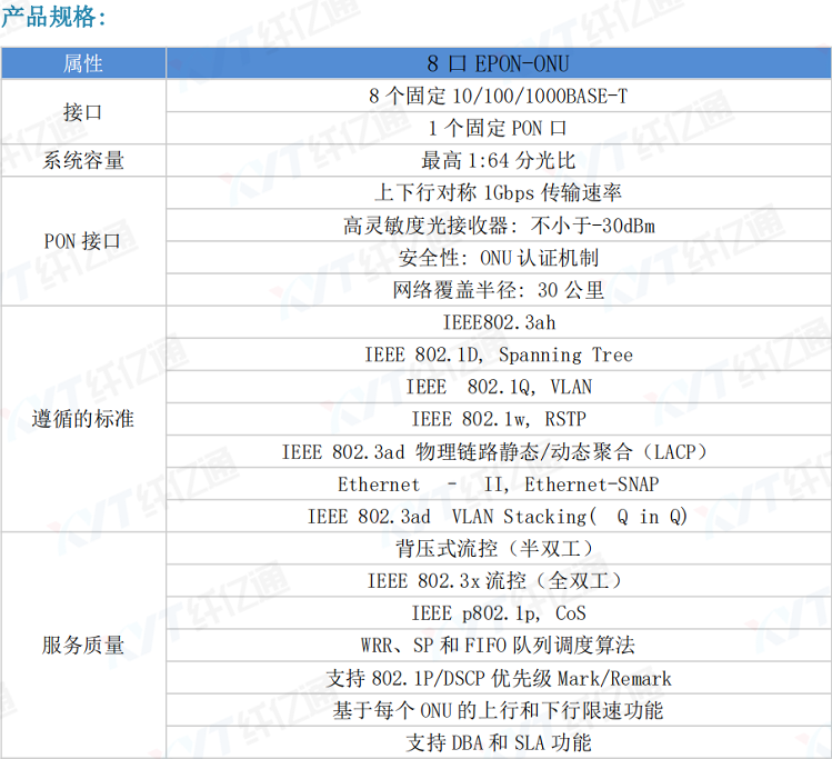 8口EPON-ONU设备是遵循IEEE802.3ah和中华人民共和国通讯行业标准(YD/T 1475-2006)的MDU设备,集成以太网交换机功能和光网络单元ONU功能,可以与纤亿通OLT产品有机结合,组建高效的EPON解决方案。可以很好的满足广电双向网、运营商FTTO/FTTB的应用。