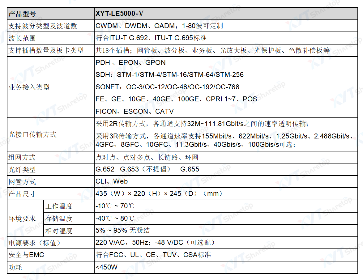 XYT-LE5000系列是纤亿通科技推出的新一代光传输系统,该系统业务集成度高,端口密度大,可接入业务类型丰富,配置灵活,并支持基于SNMP协议的图形化管理界面,可进行远程管理,功能设置,同时可以对局端机架的工作环境温度,工作电压, 冗余电源备份状态, 散热风扇工作状态实时监测。 为管理、维护提供非常清晰的故障定位,节省维护成本。