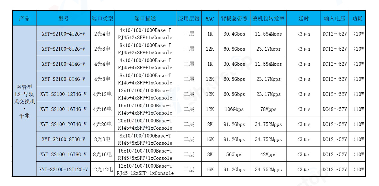 网管型千兆4光8电XYT-S2100-8T4G-V工业以太网交换机,产品符合FCC、CE、ROHS标准。支持4个千兆光口和8个千兆电口,支持一路console口;支持工业现场所需的以太网二层协议,保证通信网络的稳定性;该系列交换机采用低功耗、无风扇设计,确保无噪声干扰,同时支持-40~80℃工作温度和良好的EMC电磁兼容性能,保证在恶劣的工业环境中保持稳定的工作,为工厂自动化,智能交通,视频监控等工业应用领域组建快速稳定的网络终端接入网络提供安全可靠的解决方案。护等级的外壳及 LED 指示灯,使之成为一个即插即用的工业级设备,为用户的以太网设备联网提供可靠、便捷的解决方案。