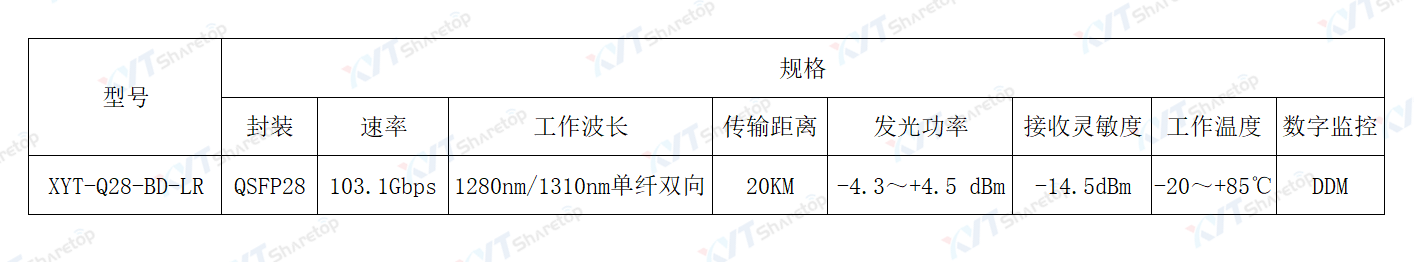 纤亿通科技推出的XYT-Q28-BD-LR是一款用于100Gb以太网的多模光模块,该模块是用于短距离数据通信和互连应用的高性能模块。它主要采用4x25Gb/s LAN WDM的方案实现在单工LC发射4个不同波长和接收4个不同波长的单纤双向传输,工作波长为蓝波段1280 nm附近4个波长 和红波段1310 nm附近4个波长,支持热插拔,在单模光纤上可有效传输20km。