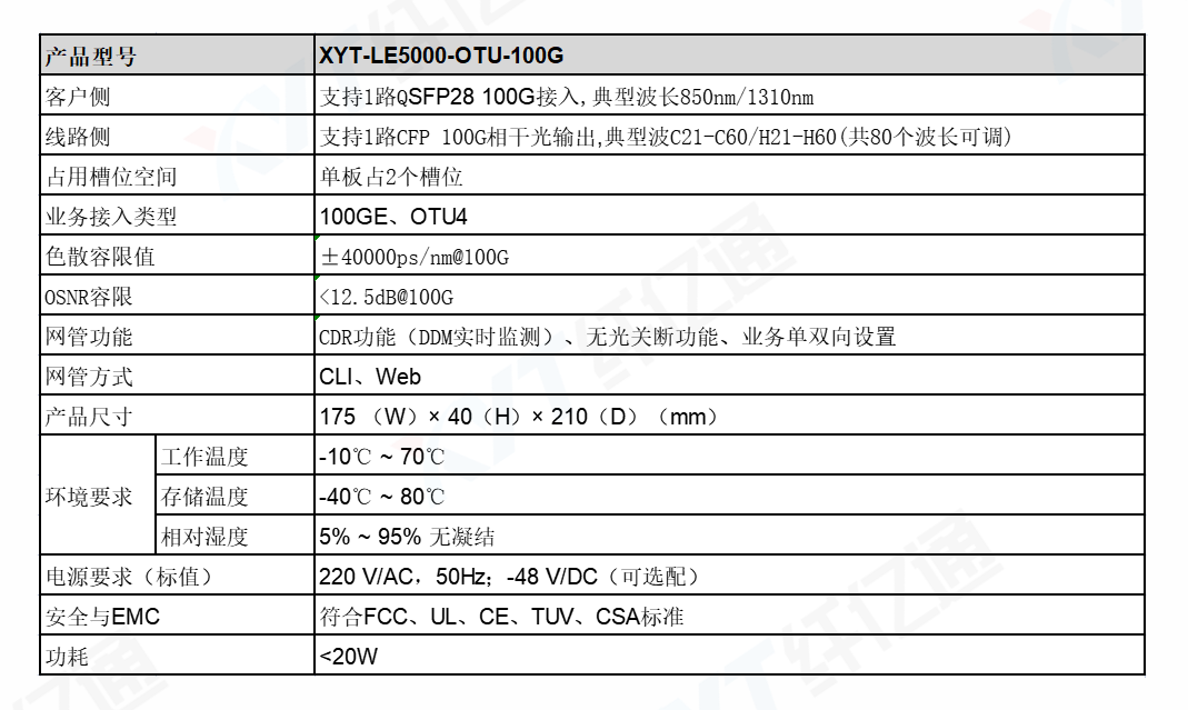 100G CFP OTU板(XYT-LE5000-OTU-100G)是一款用于100G业务接入的功能板卡,该板卡功能强大,可实现对CFP相干光模块波长调谐,输出DWDM标准波长光信号,配合波分设备或者OTN设备实现超大带宽T级业务量传输。广泛应用于运营商骨干网建设、政企骨干网建设、数据骨干线路传输。