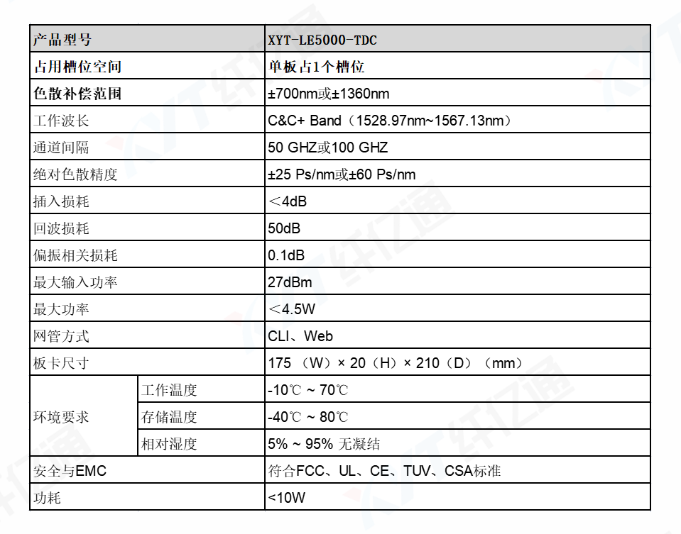 TDC可调色散补偿板(XYT-LE5000-TDC)是纤亿通科技研发用于高速传输系统的电可调色散补偿模块,基于温度调节色散补偿光纤输出的原理实现精准色散补偿,可用于10G/25G/40G/100G远距离的光通信传输系统和数据中心互联,具有远距离补偿、高输出精确度以及低插入损耗、低相位抖动、低群延迟抖动、低PDL和PMD等特点。目前广泛应用于25G和100G波分系统长距离传输。