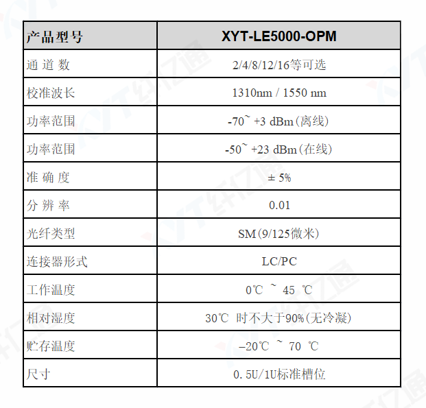 XYT-LE5000系列是纤亿通科技推出的新一代光传输系统,该系统业务集成度高,端口密度大,可接入业务类型丰富,配置灵活,并支持基于SNMP协议的图形化管理界面,可进行远程管理,功能设置,同时可以对局端机架的工作环境温度,工作电压, 冗余电源备份状态, 散热风扇工作状态实时监测。 为管理、维护提供非常清晰的故障定位,节省维护成本。