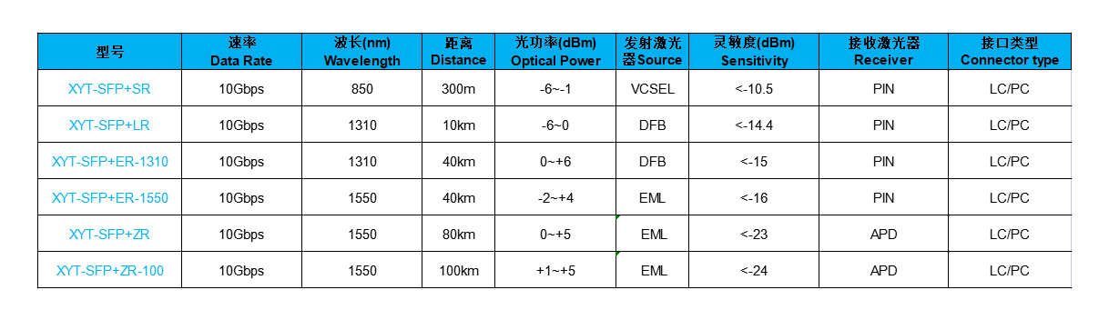 深圳纤亿通科技有限公司生产的SFP+光纤模块(10 Gigabit Small Form Factor Pluggable)是一种可热插拔的,独立于通信协议的光学收发器,通常传输光的波长是 850nm, 1310nm 或1550nm,用于10G bps的SONET/SDH,光纤通道,gigabit Ethernet,10 gigabit Ethernet和其他应用中,也包括 DWDM 链路。