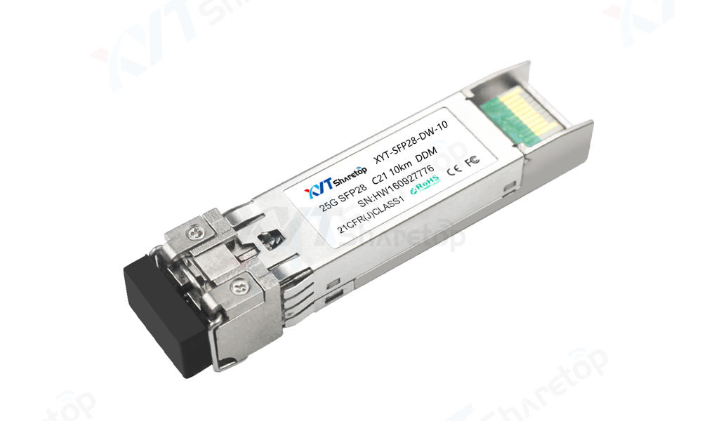 纤亿通25G 彩光模块包含SFP28-CWDM和SFP-DWDM两款。本款属于25G SFP28-DWDM,传输波长为C21~C60,单模传输,可传输10km。可用于5G基站前传或数据中心同城互联波分复用传输,可实现25Gbit/s快速通信。