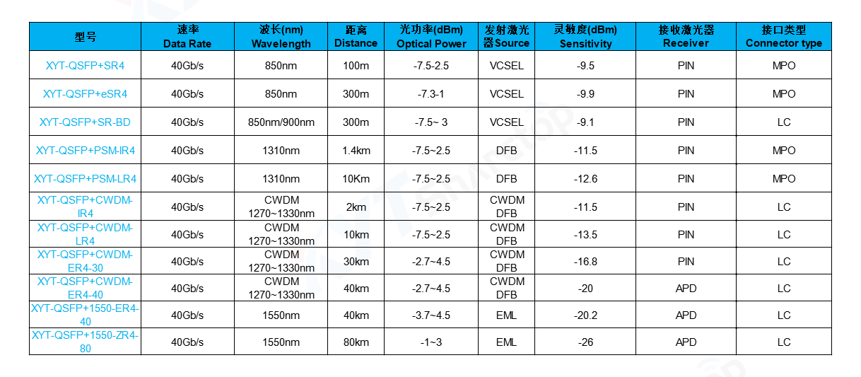 纤亿通科技推出的40G 符合QSFP MSA标准,采用高可靠度的激光器,传输距离有100m、300m、1.4km、2km、10km、30km、40km、80km,可热插拔、内置数字诊断功能,低功耗。本款为QSFP+SR4,产品特性如下: