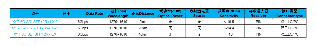 纤亿通科技推出的SDI光模块根据速率不同有:3G-SDI、6G-SDI、12G-SDI。本款为6G-SDI双收模块,同时兼容SD-SDI、HD-SDI、3G-SDI、6G-SDI,传输距离有:2km、20km、40km,产品特性如下: