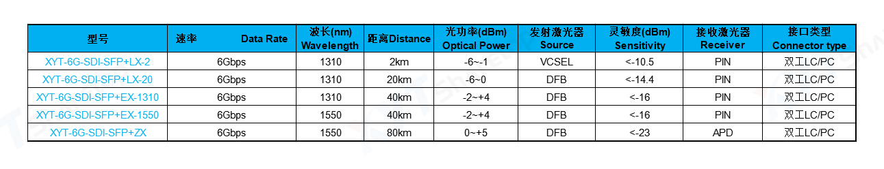 纤亿通科技推出的SDI光模块根据速率不同有:3G-SDI、6G-SDI、12G-SDI。本款为6G-SDI双纤模块,同时兼容SD-SDI、HD-SDI、3G-SDI、6G-SDI,传输距离有:2km、20km、40km、80km,产品特性如下: