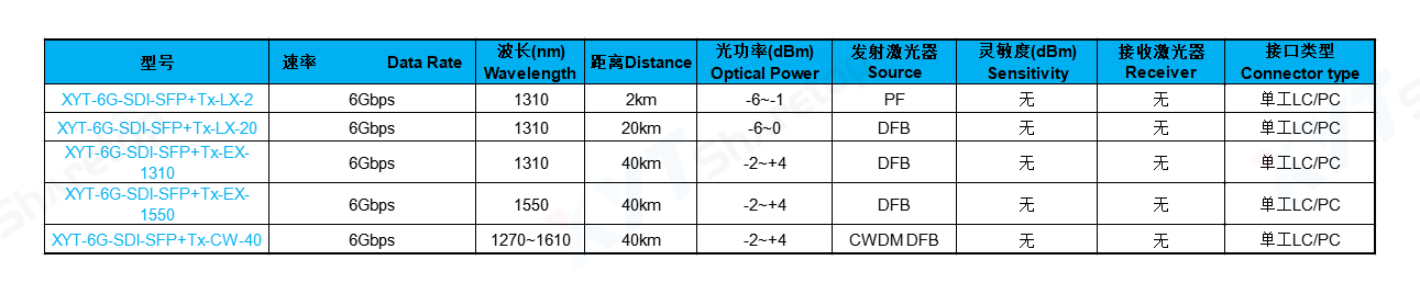 纤亿通科技推出的SDI光模块根据速率不同有:3G-SDI、6G-SDI、12G-SDI。本款为6G-SDI单发彩光模块(CWDM),同时兼容SD-SDI、HD-SDI、3G-SDI、6G-SDI,传输距离有:40km,产品特性如下: