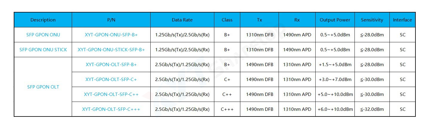 纤亿通科技推出的SFP GPON ONU光模块型号为:XYT-GPON-ONU-SFP-B+。产品特性如下: