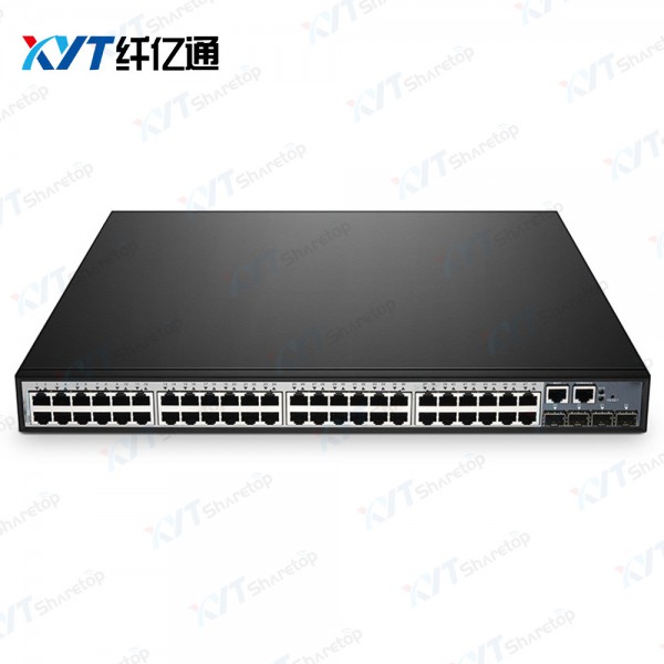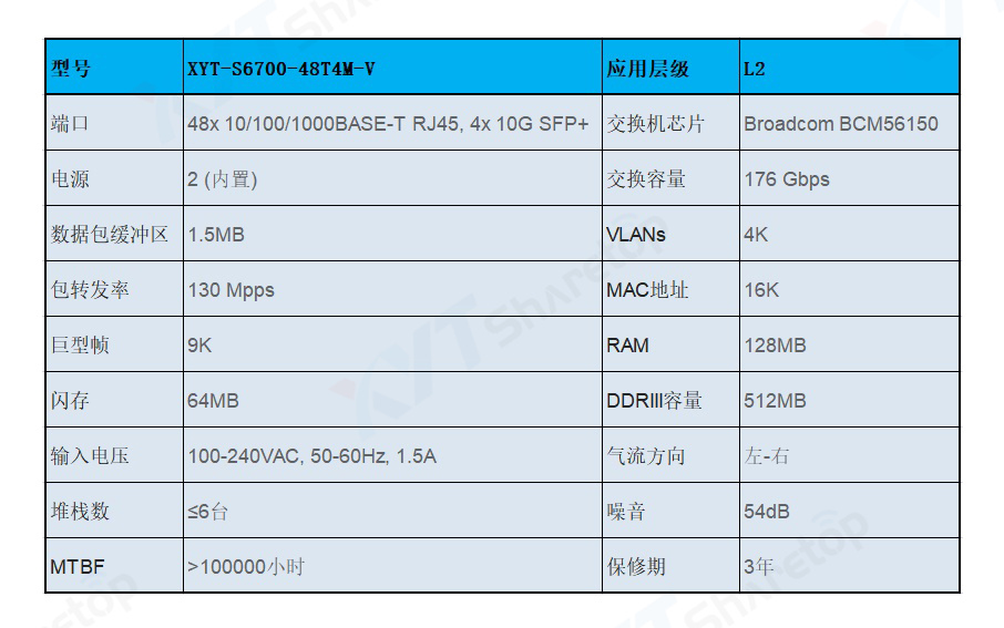 本款型号为XYT-S6700-48T4M-V万兆二层交换机,包含4个万兆SFP+光口,48个千兆RJ45电口。