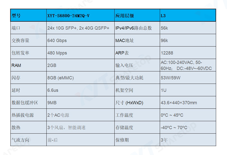 本款型号为XYT-S6800-24M2Q-V,40G三层交换机,包含2个40G QSFP+光口,24个万兆SFP+光口。