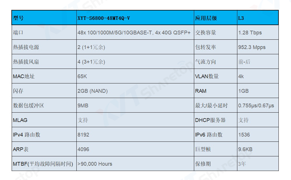本款型号为XYT-S6800-48MT4Q-V,40G三层交换机,包含4个40G QSFP+光口,48个万兆RJ45电口。