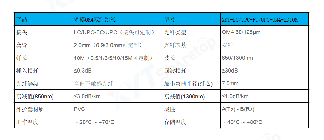 产品编号:XYT-LC/UPC-FC/UPC-OM4-2D10M