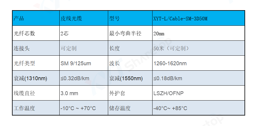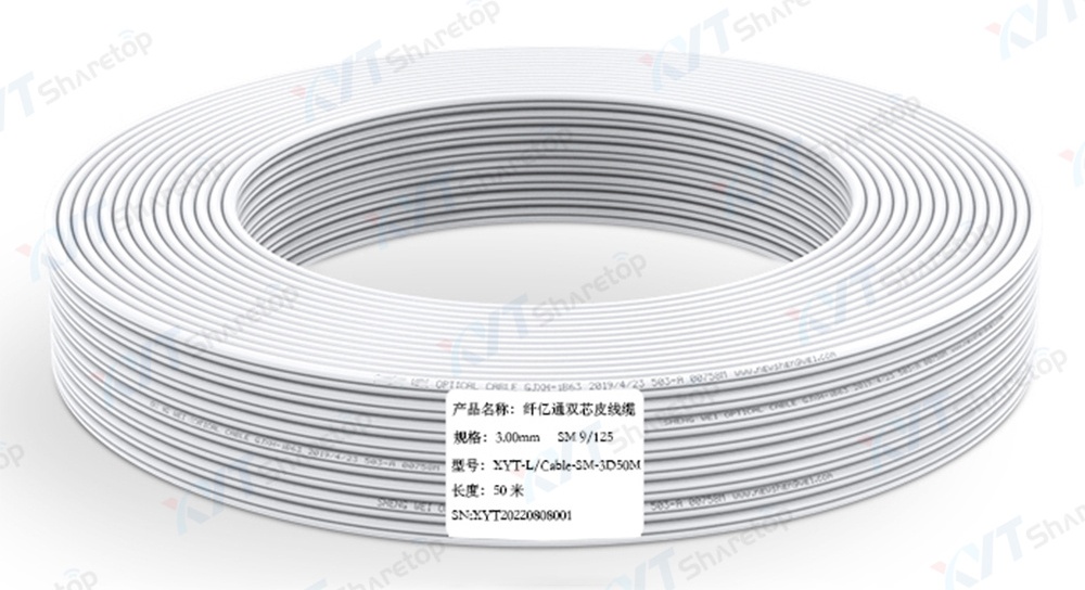 皮线光缆多为单芯、双芯结构,也可做成四芯结构,横截面呈8字型,加强件位于两圆中心,可采用金属或非金属结构,光纤位于8字型的几何中心。皮线光缆内光纤采用G.657(单模)小弯曲半径光纤,可以以20mm的弯曲半径敷设,适合在楼内以管道方式或布明线方式入户。