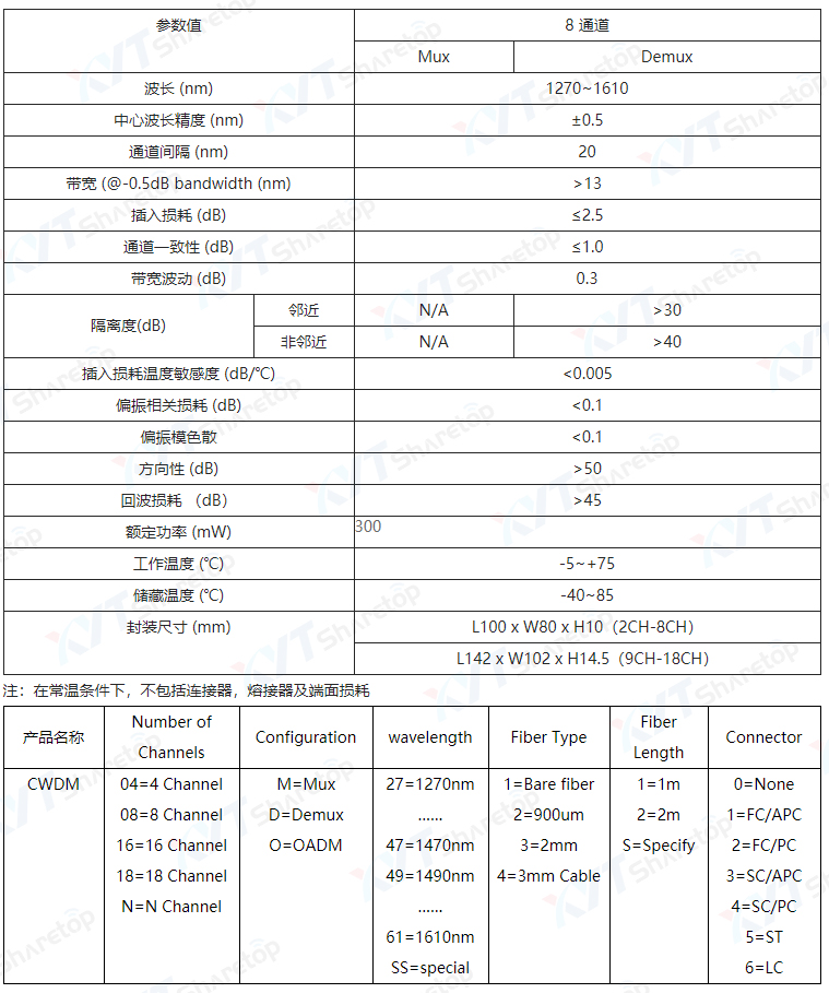 CWDM采用薄膜滤波片技术,波长稳定性好,可根据要求配置升级端口具有较低的插损,具有较高隔离度,性能稳定性和高温度稳定性.,产品具有低插损,高通道隔离度,宽带宽及低温度敏感性等特点。一般分为4通道,8通道,16通道或者多达18通道粗波分复用器。由于粗波分系统低插损的要求,在通道数多时,模块可添加跳片以降低各通道插损。普通的粗波分封装形式分为:ABS盒式,LGX 盒式和19英寸1U机箱封装等。