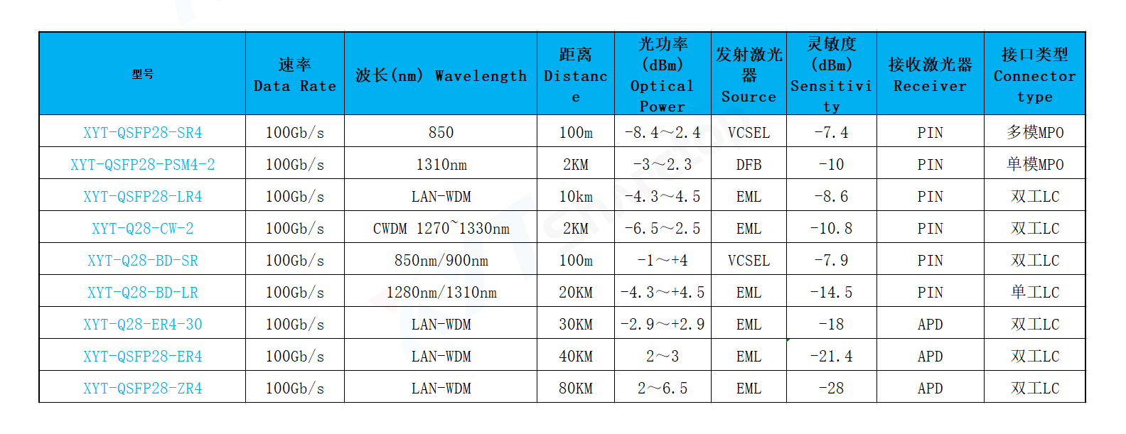 光模块(optical module)由光电子器件、功能电路和光接口等组成,光电子器件包括发射和接收两部分。深圳纤亿通科技有限公司生产的100G QSFP28光模块采用LC光口,兼容IEEE802.3ba和CFP MSA等标准;具有功耗低、体积小、速率高等特性,有利于数据中心增加容量、提高端口密度和降低功耗。