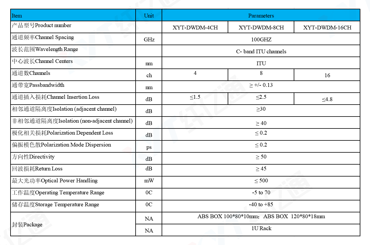 纤亿通100G信道间隔密集光波分复用器/解复用器采用成熟的多腔介质膜实现光的滤波,波长稳定性好,采用密封工艺封装,环境稳定性高.