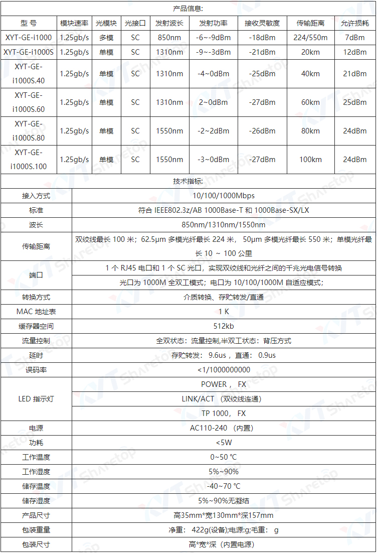 1.支持10Base-T、 100Base-TX 或1000Base-T自适应与1000Base-SX/LX间相互转换,光口为 1000M 全双工模式