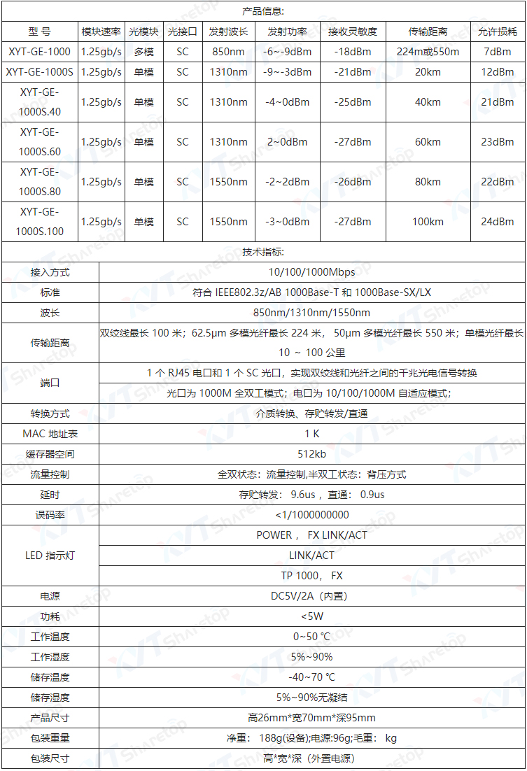 1.支持10Base-T、 100Base-TX 或1000Base-T自适应与1000Base-SX/LX间相互转换,光口为 1000M 全双工模式