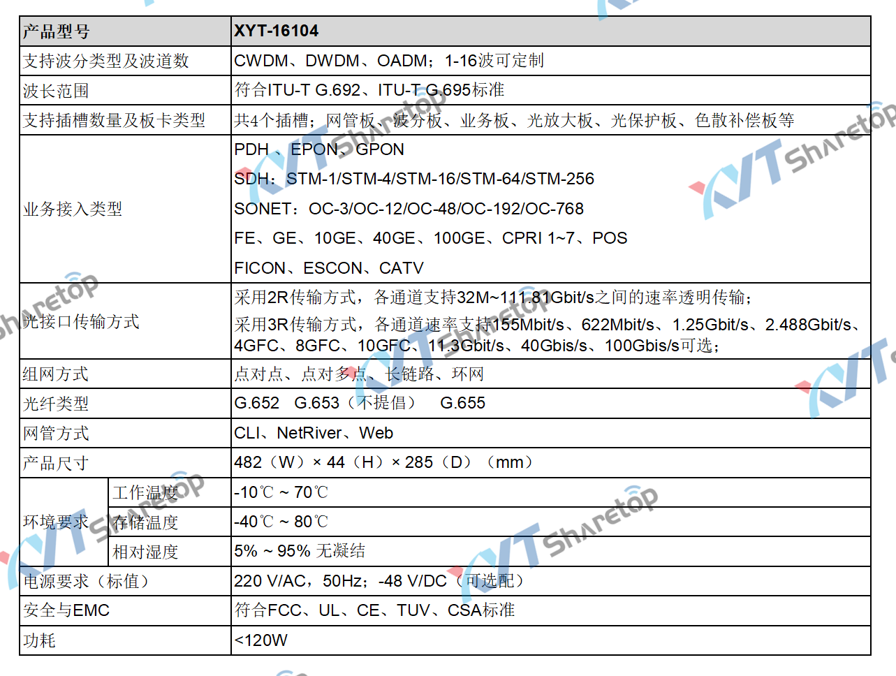 XYT-16104系列产品是一款支持多种业务接入的有源波分系统,该系统业务集成度高,端口密度大,配置灵活,传输容量大。