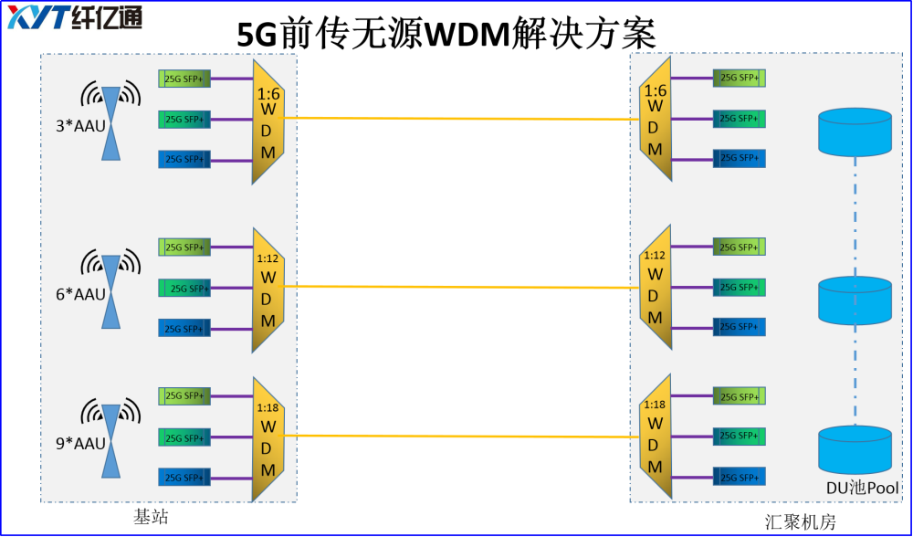 纯无源方案: 纯无源方案主要配置产品为无源波分+彩光模块。 无源波分可供选择的类型有:无源粗波分和无源密波分。支持通道定制,无源粗波分常见通道有6/8