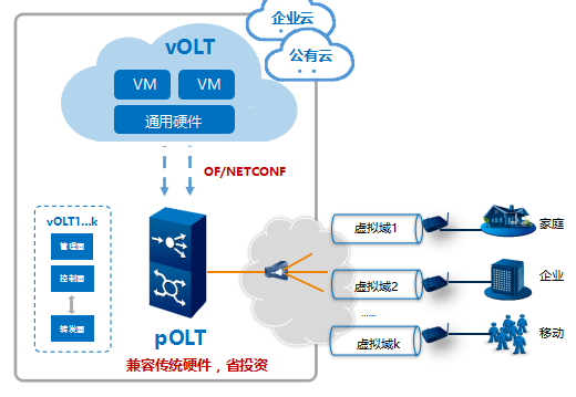 OLT虚拟化,提升网络运维,随需接入:按需划分,随需接入,将一台OLT虚拟成多台OLT,并将不同的虚拟OLT分配给不同的业务如家庭、企业、移动通信等进行多业务的智能运营,从而帮助收编老旧OLT,缩减CO机房数量,降低运营费用。软硬件资源隔离,更加安全可靠。不同虚拟OLT独享硬件资源,保证专线和自营业务高安全。