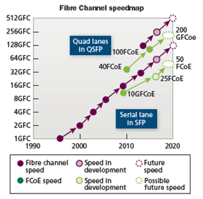 由于光纤通道FC具有高速率、低抖动、和高可靠性等特点,因此成为服务器和存储设备连接的首选。随着服务器和存储技术的不断发展,光纤通道FC的速率也在不断提高。