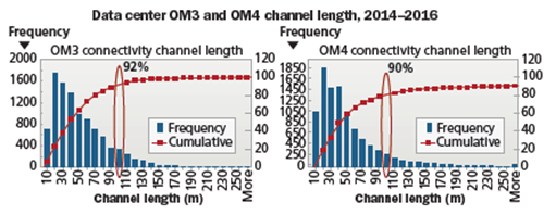 基于以太网和光纤通道传输标准,技术发展以及商业可行性,康宁建立了数据中心多模和单模光纤连接通道长度的模型。数据表明,随着以太网速率从10G增加到40G和100G,及光纤通道速率从8G到16G和32G,数据中心用户部署OM3/OM4多模光纤,90%以上的距离都是100米内。换句话说,对于绝大多数的数据中心用户,100米的通道距离足以满足他们的需求。