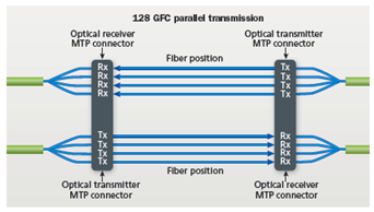 光纤通道FC-PI6标准中包含了128 GFC协议,采用QSFP收发器及 8或12芯 MTP接口。128 GFC采用并行传输技术,并行传输不同于传统的双芯串行方式,其每芯光纤传输32GFC,即:4芯承载发送信号(4 x 32 GFC) 和4芯承载接收信号(4 x 32 GFC)。128 GFC也是第一次被定义为并行传输的光纤通道传输技术。未来FC-PI7 还将推动256 GFC并行传输方式。