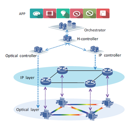 层次化控制器架构的多域SDON技术方案架构可以分为四个层面:应用层、总控制器层、单域控制器层和设备层。这四个层相互独立,但又密切联系。
