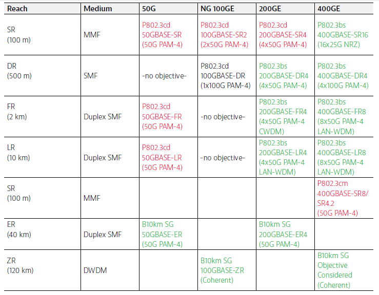 IEEE 802.3bs,802.3cd,802.3cm,B10km SG分别定义的不同物理接口及相应的技术(如下图1-1所示),其中bs已经完成标准化,cd接近完成标准化。但是所有技术所有采用的主要技术实现大体相同,主要包括: