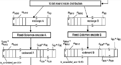 FEC 前向纠错编码在OTN技术里应用历史非常久远,但在客户侧高速以太网里却是刚刚起始,其原理主要是在物理层编码阶段通过增加一定的信息比特(一般通过超频实现)来实现从软件算法层面实现针对由于链路的余量,链路噪声,串扰或反射导致误码的在线实时纠错,最终FEC上层实现纠后零误码(丢包),以实现可靠的链路传输,同时不增加被传物理媒介的硬件成本,如下图1-3为典型的200GE/400GE 所采用的KP4 FEC(544,514,15)编码处理解析框图,其通过链路的3%的信息冗余,来实现每个5440bit的编码块里,最大可实现150 bit的快速纠错,以此通过软件的方式有效提高链路的信噪比余量,保证链路可靠传送。