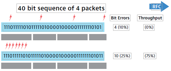 丢包率. 丢包率是以太网业务应用评估其传输特性的最基本的指标,根据相应的处理顺序,如果链路出现误码,接收端经FEC层后无法进行全部纠错,最终传递到MAC层,任何bit错误发生在Frame的任何区域,都会导致整个以太网帧被丢弃,长帧程度影响会更大。因此,最终到达MAC层的误码的分布情况直接影响丢包率。如下图1-4所示,4比特的错误最终造成的对以太网帧影响比10bit的错误的影响要大的多。