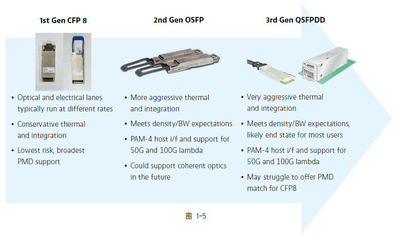 QSFP-DD封装形态. 随着过去的两年的发展,下一代基于PAM-4技术的典型400G客户接口正从第一代的CFP8封装形式,快速向第二代或第三代的OSFP和QSFPDD的形态转移,作为市场最终认可的封装形态,由于其具有封装小,功耗低,端口可向下兼容低速模块。如下图1-5所示,其光口主要可实现单波50G或单波100G,电口一般为50G PAM-4。