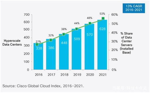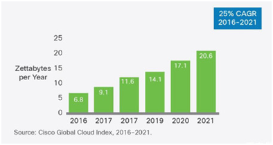 近年来,全球流量爆炸性增长。2021年全球流量年度总量将达到20.6ZB,2016年年度流量总量为6.8ZB。2016-2021年,全球流量的年度复合增长率为25%。同时,思科预计,超大规模数据中心将从2016年的338座增长至2021年的628座。届时,超大规模将会占据数据中心市场53%的市场份额。到2021年,超大规模数据中心内的流量将会增长四倍。目前,超大规模数据中心占据39%的数据流量,2021年将增至55%。因此,数据中心对带宽的要求越来越高,下一代数据中心的建设需要成本更低、带宽更宽的传输介质。在短距离应用中,垂直腔面发射激光(VCSEL)光源的成本优势,使得多模光纤依然是数据中心首选的性价比较高的布线介质。