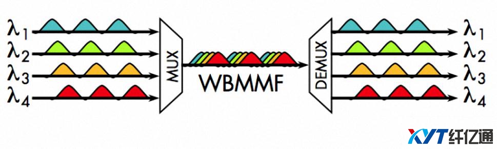 短波波分复用,就是借鉴单模光纤的波分复用(WDM)技术,扩展传输时所用的波长范围,从传统的多模光纤所用的850nm扩展至850nm-950nm,利用性价比高的短波的垂直腔面发射激光(VCSEL)光源和优化的宽带多模光纤(WBMMF),在一根多模光纤上支持四个波长传输数据,把需要的光纤芯数降低为原来的1/4,同时提高光纤的有效模式带宽(Effective Modal Bandwidth,EMB),延长传输距离。