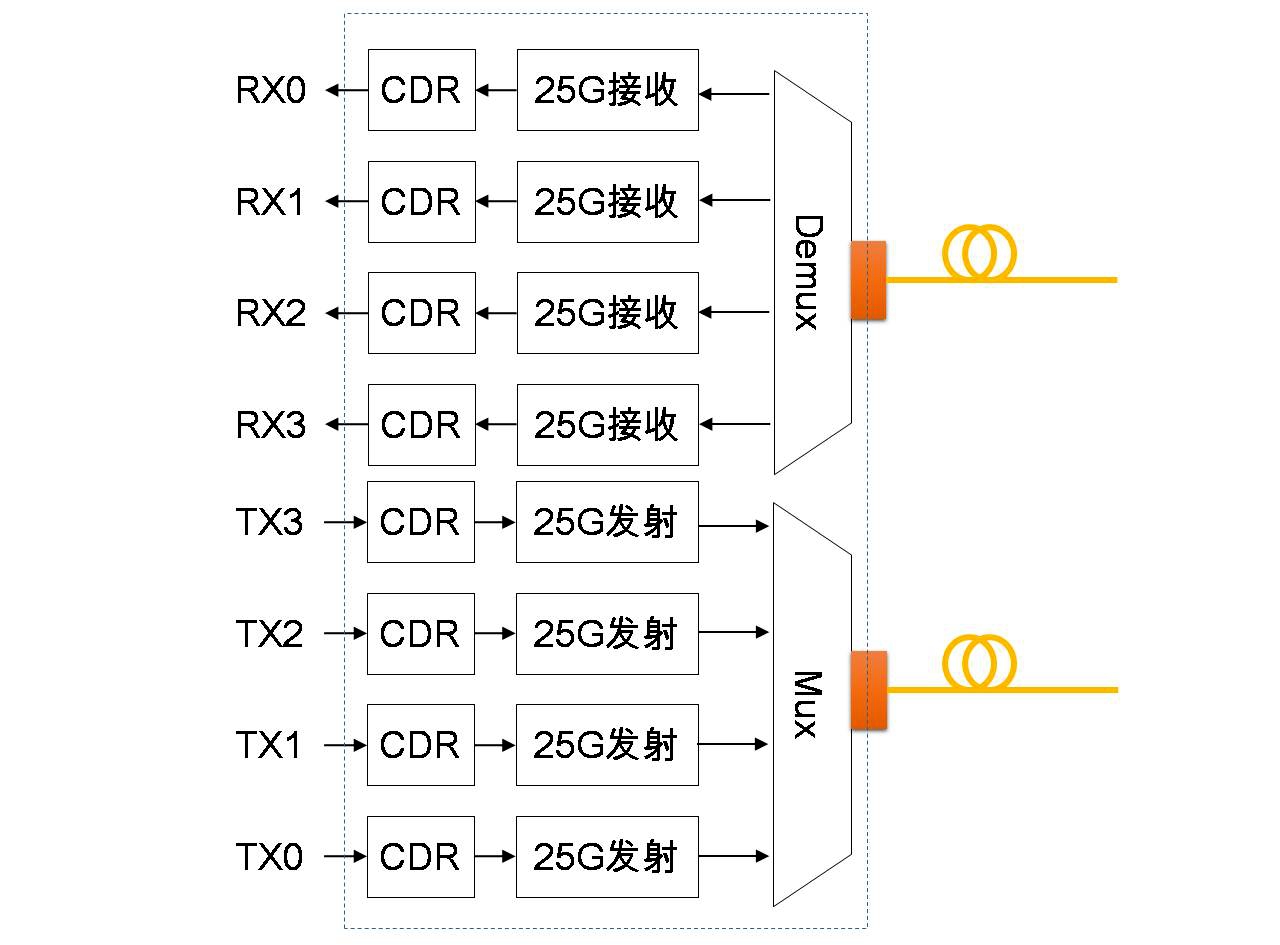 SWDM4模块包括以下几个部分:四个不同波长的光发射机,四个带有信号探测器的光接收机,波分复用器和解复用器,多模光纤双工光连接器。如图所示的是100G的光模块框图: