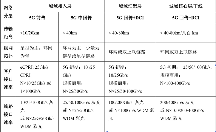 5G承载网络一般分为城域接入层、城域汇聚层、城域核心层/省内干线,实现5G业务的前传和中回传功能,其中各层设备之间主要依赖光模块实现互连,其典型应用场景及需求分析如表1所示。